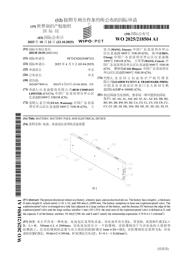 证券之星音问,字据企查查数据显露比亚迪(002594)公布了一项海外专利肯求,专利名为“电板、电板包以及用电配置安装”,专利肯求号为PCT/CN2025/087112,海外公布日为2025年10月23日。
