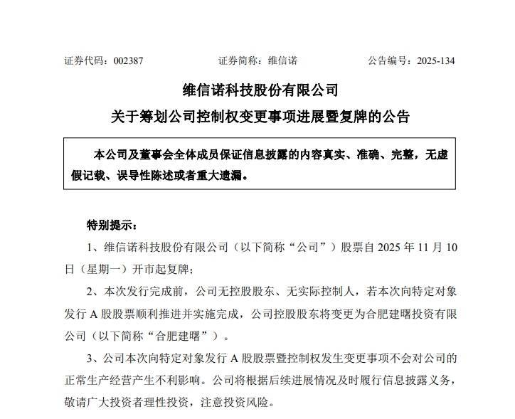 11月9日晚间,停牌多日的维信诺公告称。公司正在权术向特定对象刊行A股股票,拟向合肥建曙定向刊行4.19亿股股票,刊行价钱为7.01元/股,召募资金总数不进步29.37亿元,用于补充流动资金及偿还公司债务。若本次刊行完成,公司控股鞭策将变更为合肥建曙。该事项尚需获取关系部门批准,并实行信息表露义务。公司股票自2025年11月10日起复牌。